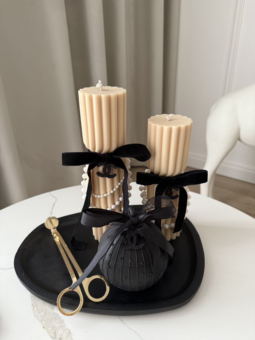 W skład zestawu wchodzą dwie wysokie świece, inspirowane domem mody Chanel.