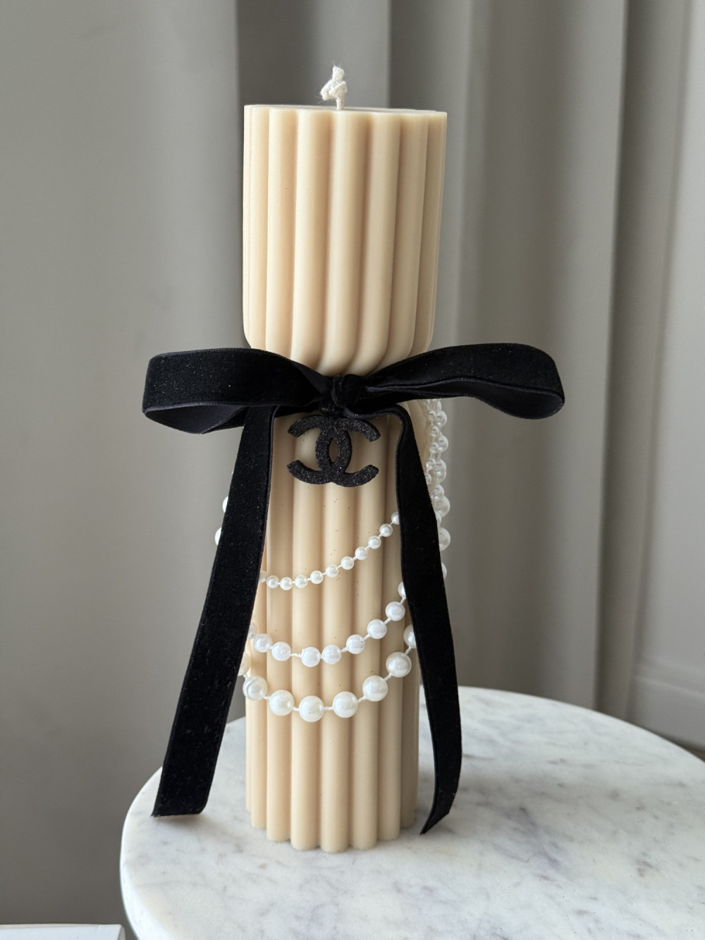 Świeca  w odcieniu beżowym , ozdobiona aksamitną czarną wstążką i perłowym łańcuszkiem — idealne połączenie klasy i luksusu. Subtelny design inspirowany paryskim szykiem sprawia, że to nie tylko świeca, ale także wyjątkowa dekoracja wnętrza.