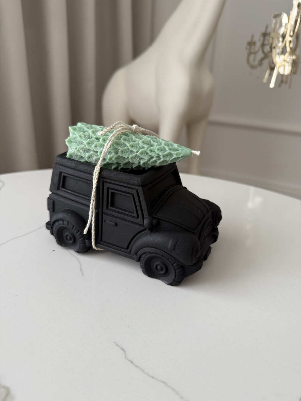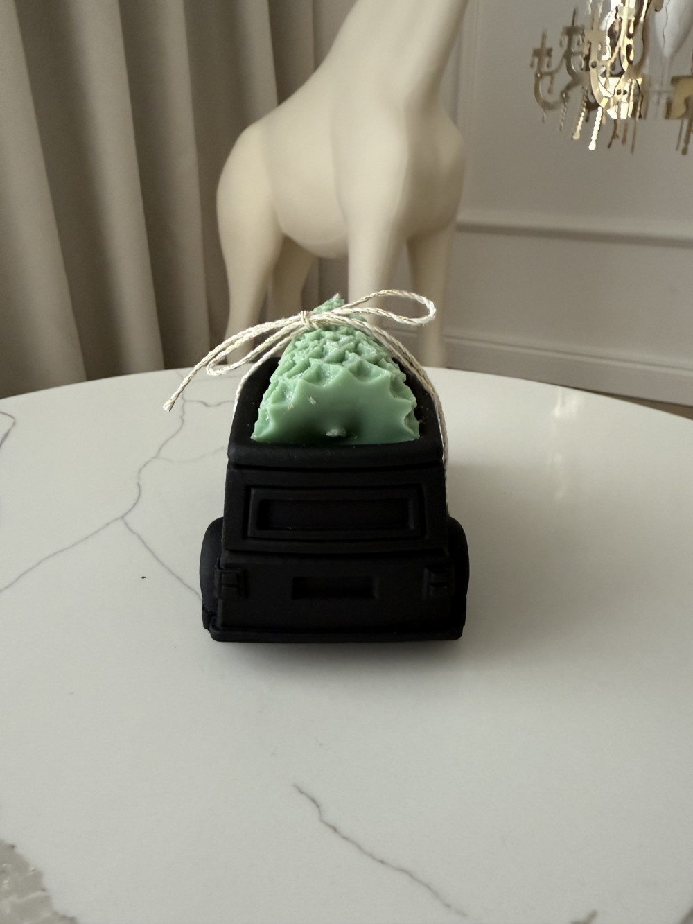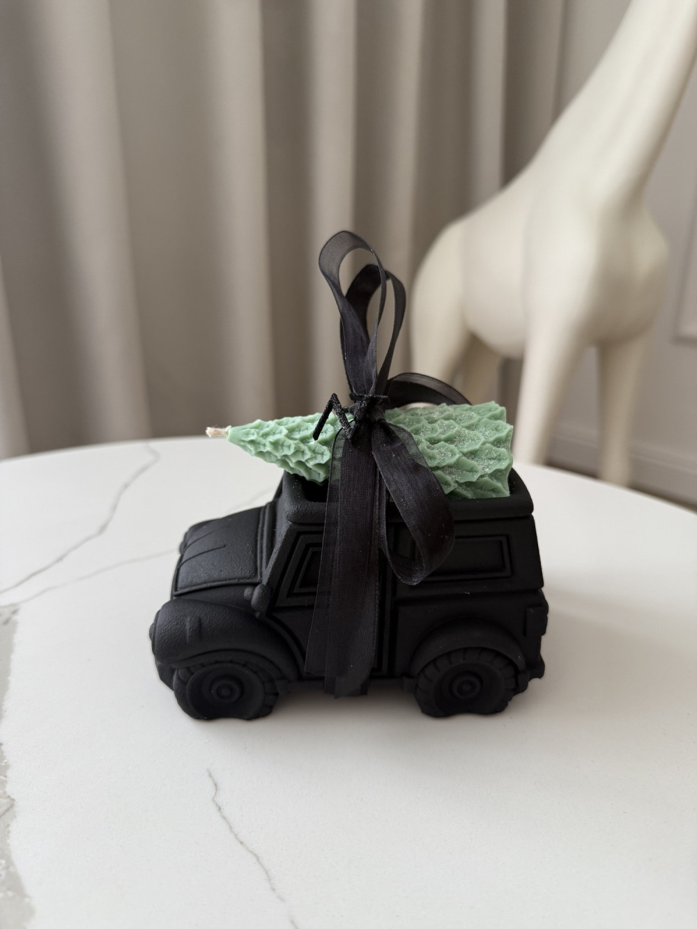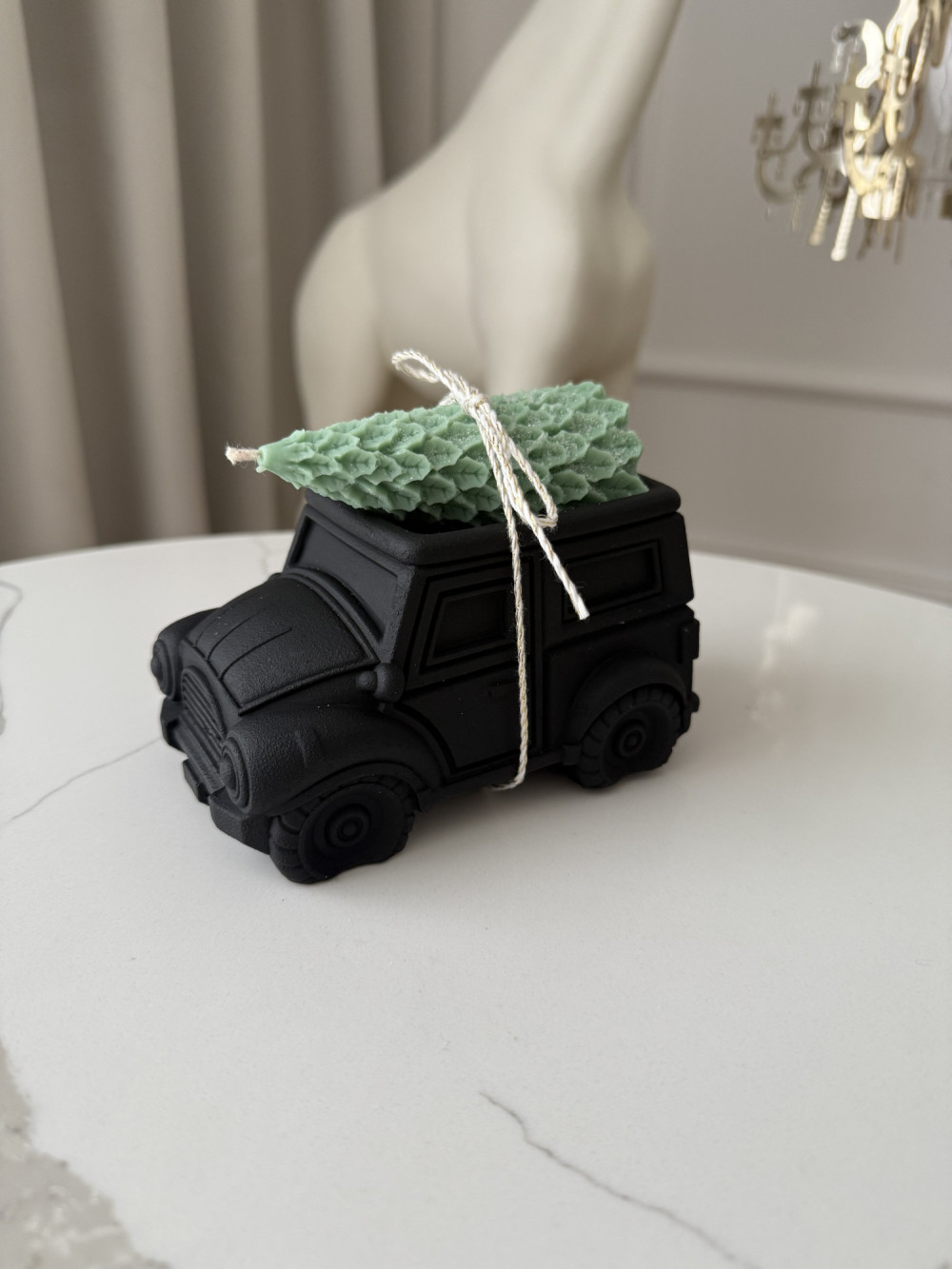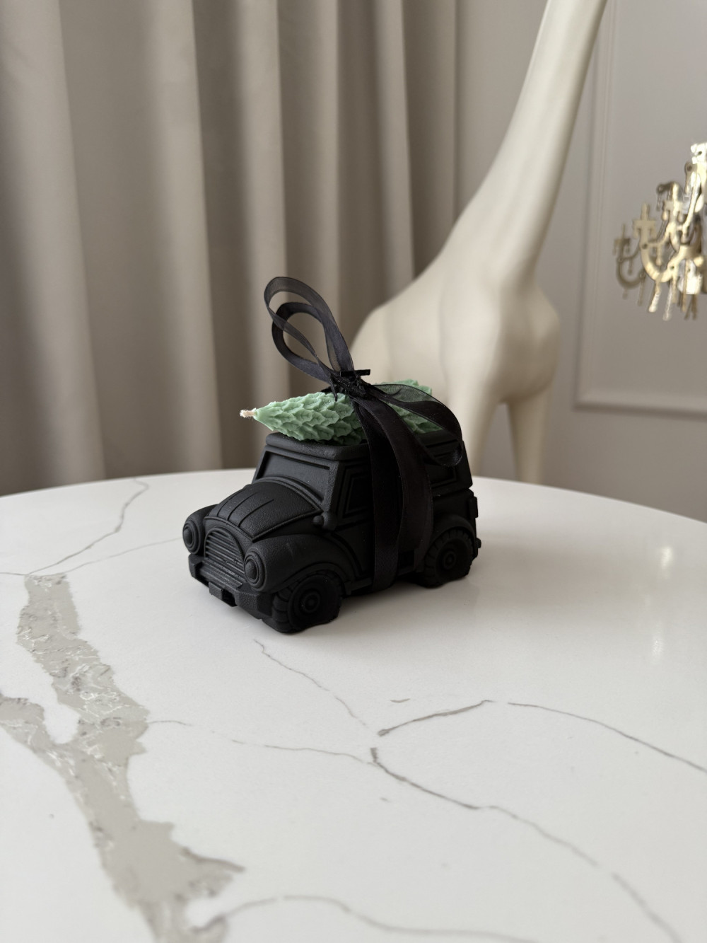 Czarne, matowe autko skrywa w sobie zalewaną świecę zapachową, a na jego dachu umieszczona jest wolnostojąca świeca w kształcie choinki — w subtelnym, zielonym odcieniu. Całość przewiązana czarną, satynową wstążką, tworzy elegancki i nowoczesny akcent świąteczny